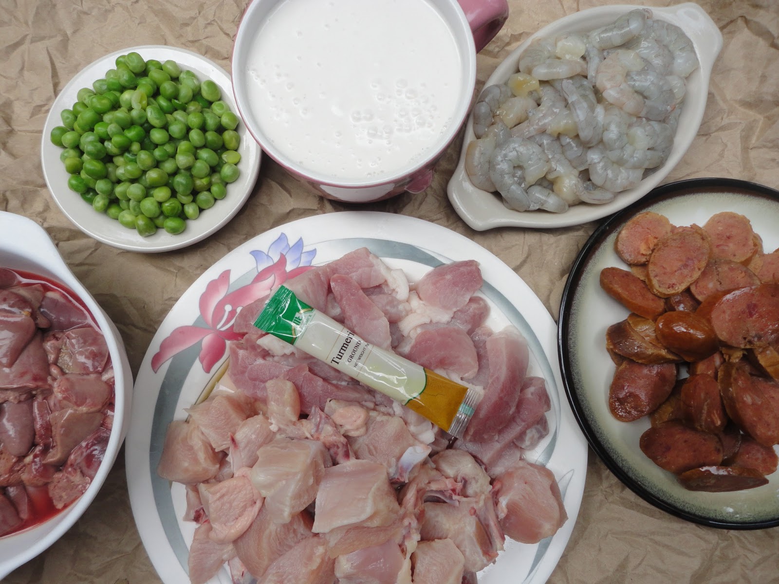 4. Saute garlic and onion in olive oil. Add the chorizo, pork, chicken, liver and shrimp. Add paprika and stir fry for 5 minutes.