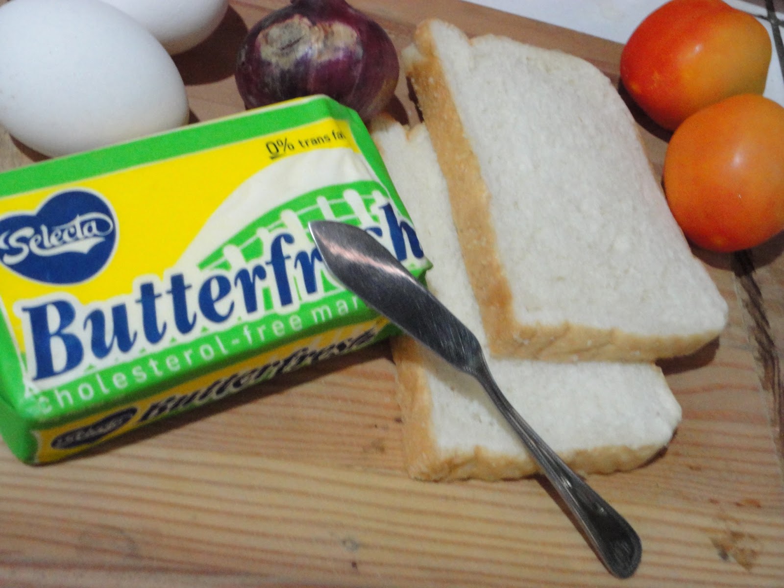 ingredients we have. Luckily, I found a half-opened tasty bread pack on our table and some eggs, tomatoes and red onions in our pantry / sari-sari store. Upon looking further and deeper in our fridge, I found unopened Selecta Margarine (I think it’s not for sale since I found no price tag on it, sorry mom you can’t hide this thing to me, hehehe).