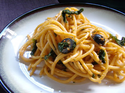 5. Add the and olives and spinach and let it wither, about 1 minute.