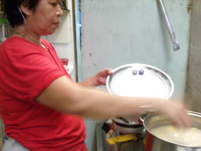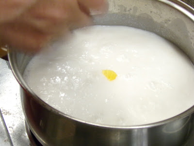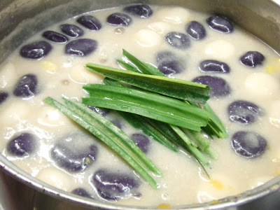 2. Dissolve 4 tablespoon of the ground glutinous rice into the coconut milk. Pour in the Coconut Milk and water and slowly simmer until the raw coconut milk taste disappear.