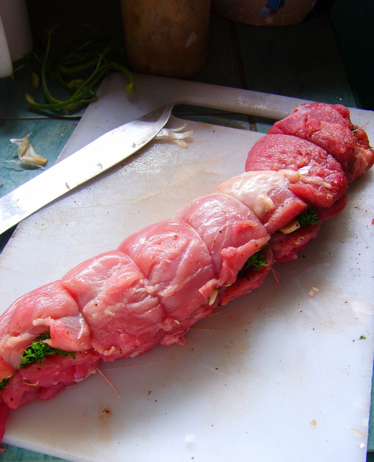 1. Preheat oven to 190 degrees Celsius. Make a slit, butterlfying the pork loin.