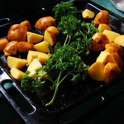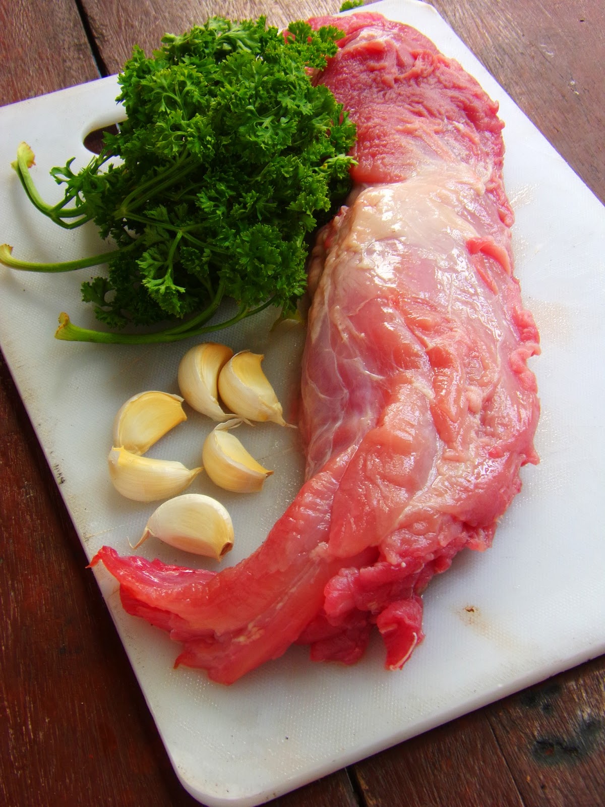 The pork loin was stuffed with garlic, parsley and Italian seasoning. Baked with bed of parsley and potatoes. Then poured with Emperador Lights (this will give additional flavor and prevent the loin from drying) and covered with aluminum foil then pop in the oven.