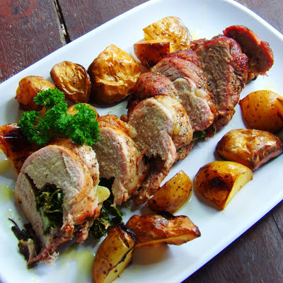 4. Prepare the baking pan. Add potatoes and line up the parsley. The parsley will serve as the bed for the stuffed pork loin. Place the stuffed pork loin, pour in the Emperador Lights and cover with aluminum foil. Pop in the oven for 50 minutes at 190 degrees Celsius. Remove foil and increase temperature to the highest mark and cook for another 15 minutes or until the top of the pork loin is golden brown. Remove from the oven and rest for 10 minutes before cutting.