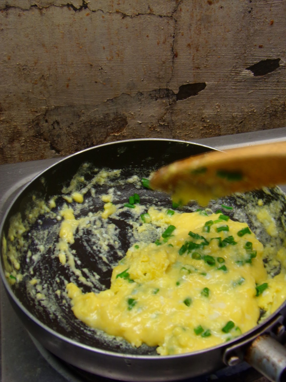 5. When the egg starts to get creamy batter in consistency, add the grated cheese, chives and salt. Remove from heat and add the remaining butter and continue whisking. The egg will continue to cook due to the heat from the pan. Serve immediately.