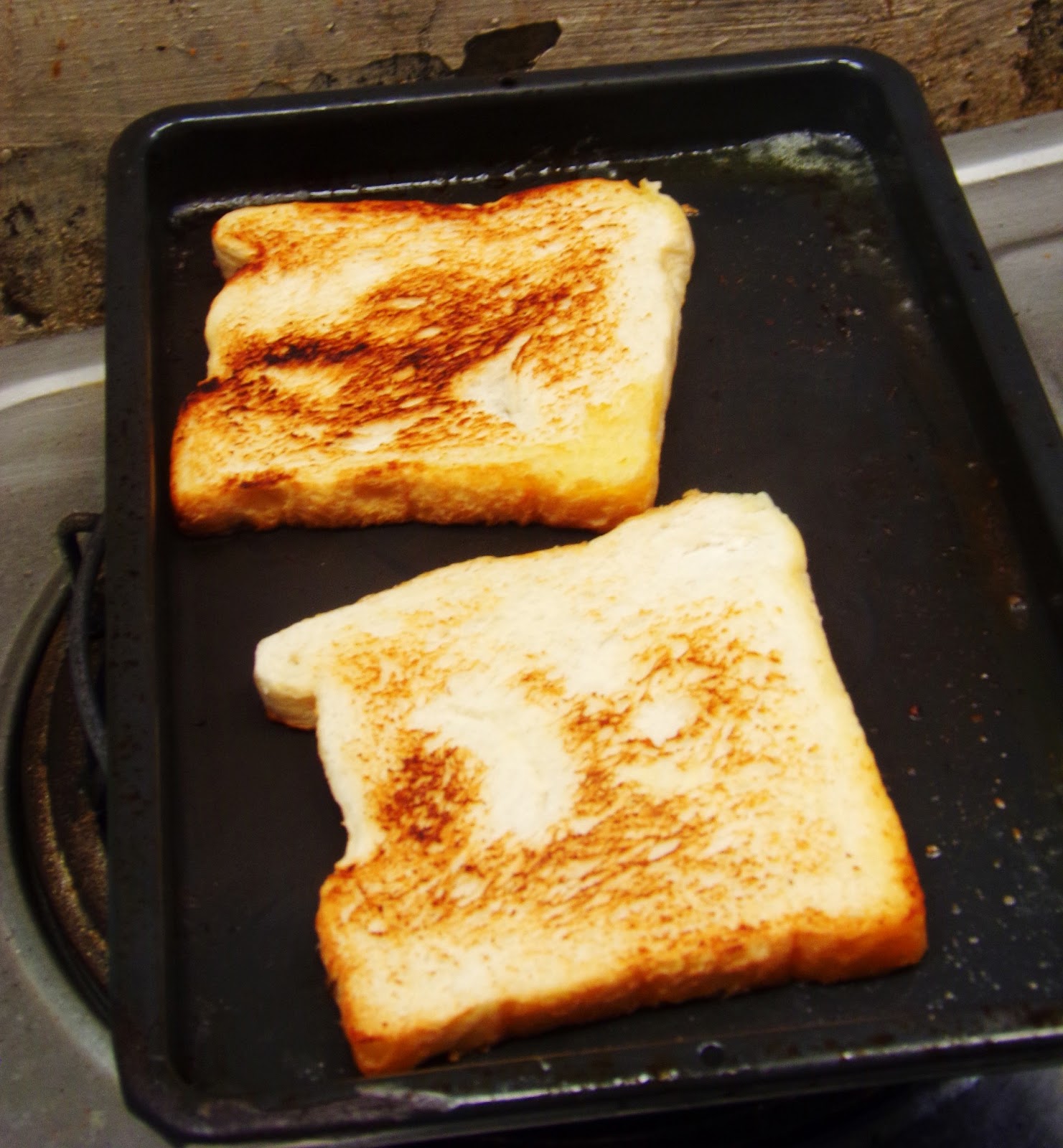 2. Place the tasty bread and toast until both sides is golden brown. Do the same with the remaining two slices of bread.