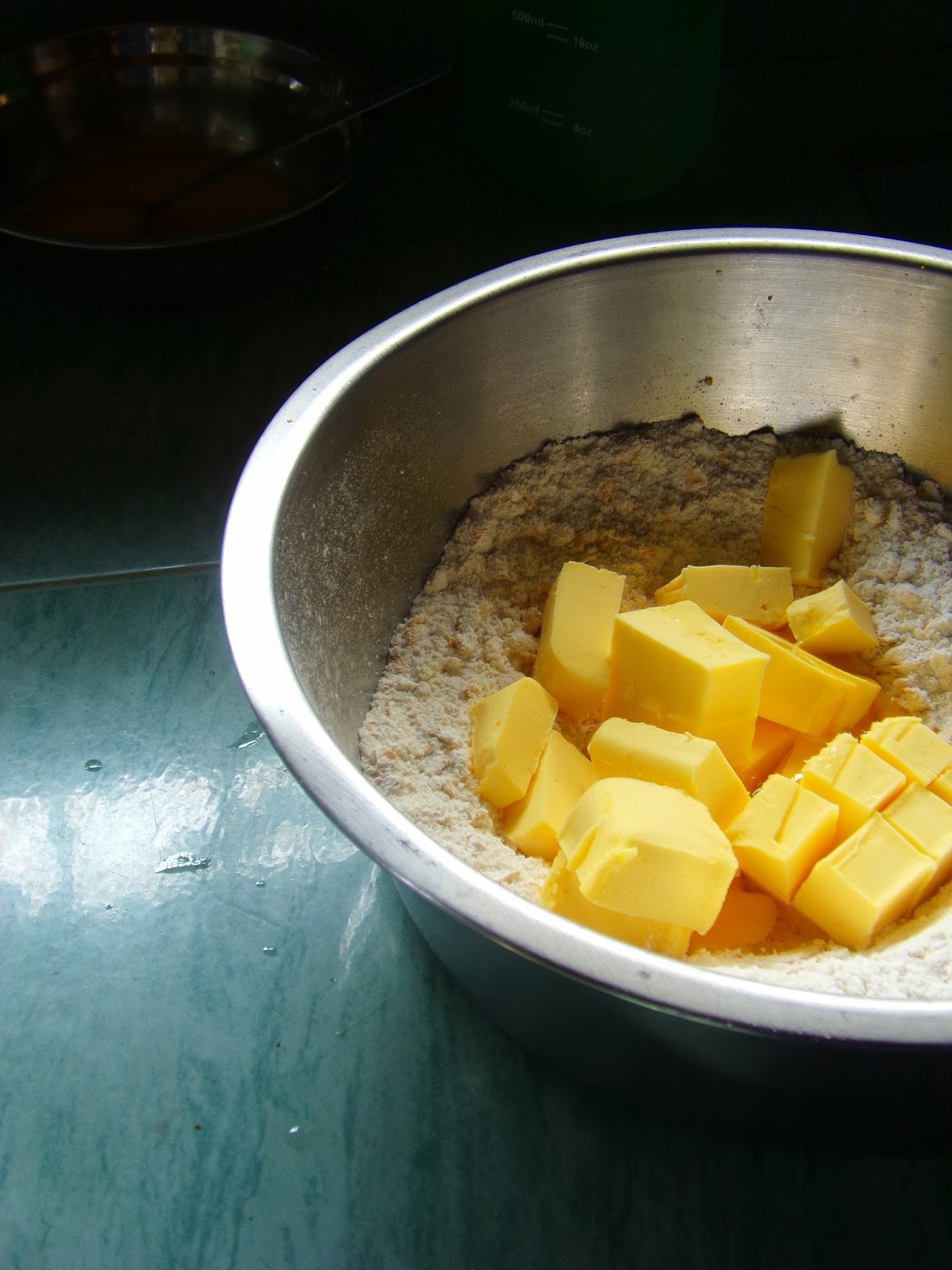 1. Preheat Oven to 190 degrees Celsius. Combine flour, oats, baking powder and sugar in a bowl. Mix until well combined.