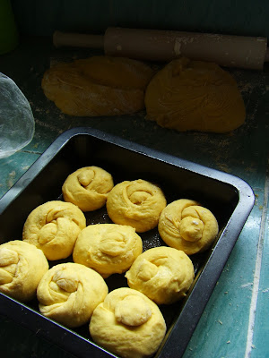 6. Roll each part into a log and divide into 9 pieces. Shape each pieces into a rope 7 to 8 inches long and coil or knot it like the photo above. Rise for another 45 minutes.