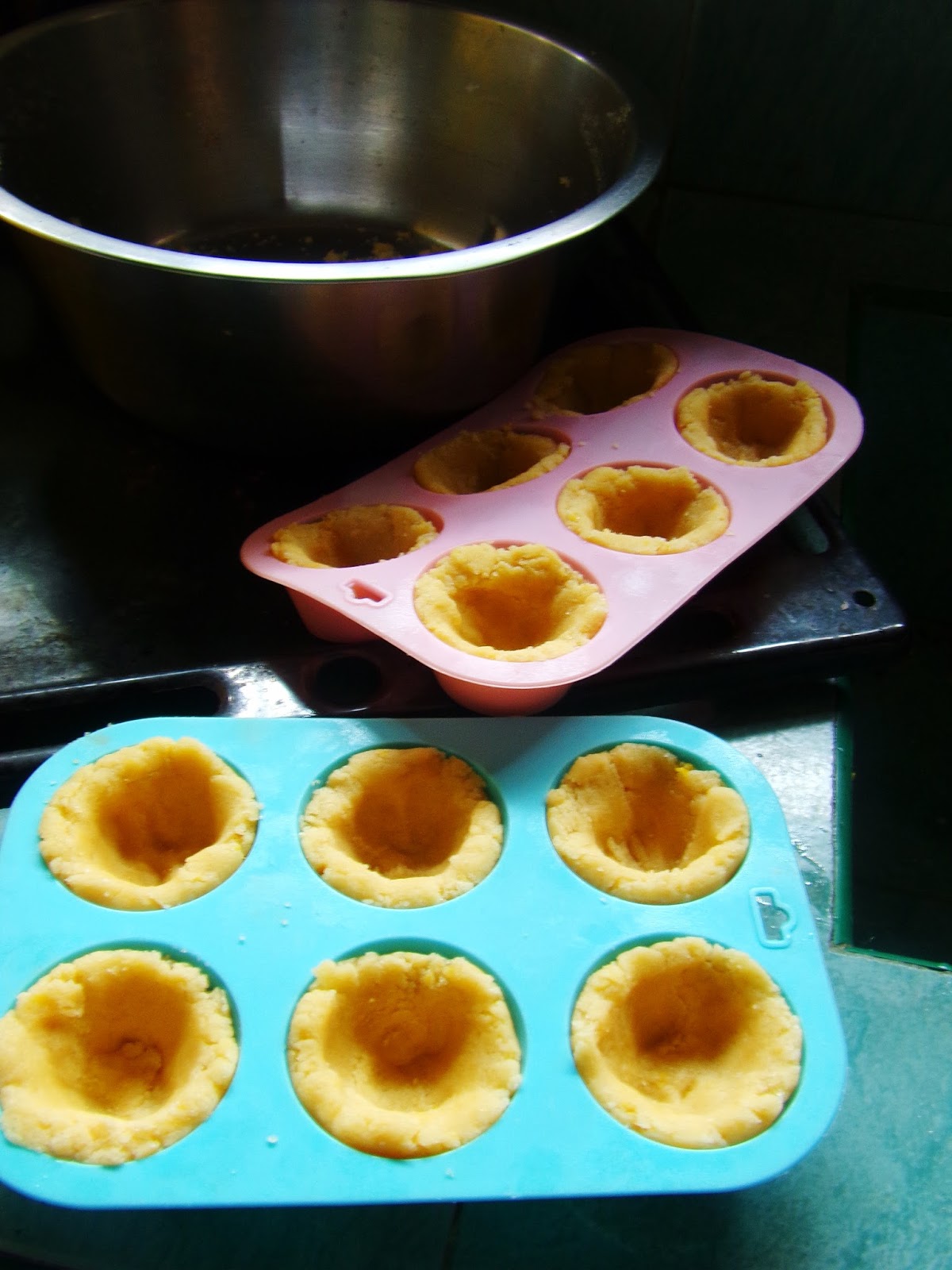 4. Reserve about 3/4 cup of the crumbs. Gently press a 2 to 2 1/2 inches ball of crumbs into 2 ounce muffin pan until it covered every sides of the muffin cup.