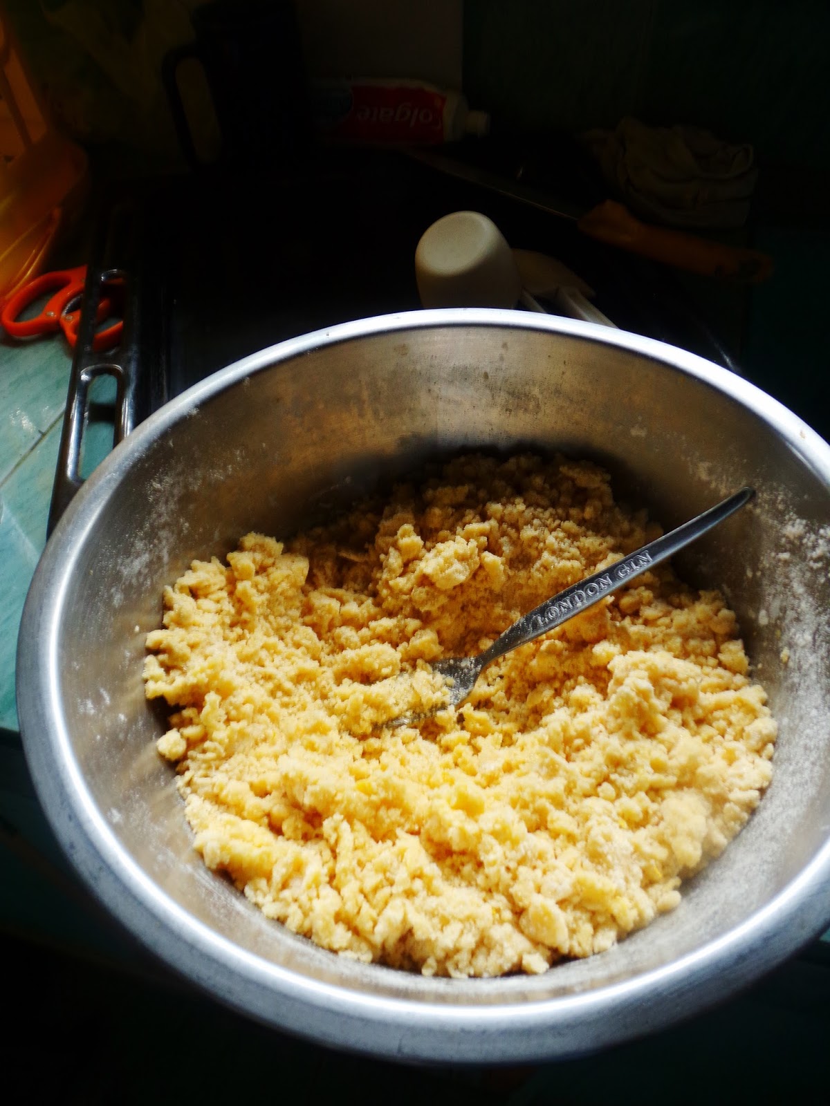3. Add egg and butter. Use fork or pastry cutter to combine everything until it turns into crumbs.