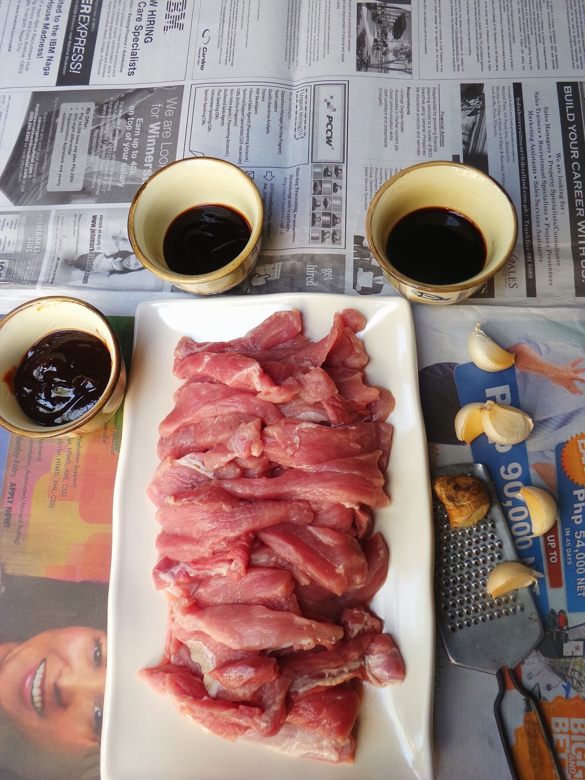 Marinate meat in soy sauce, oyster sauce, hoisin sauce, garlic and ginger. I suggest to add a tablespoon of sesame oil just before cooking the meat as to allow penetration of the marinade into the meat. The oil acts as a barrier which may hinder the absorption of the marinade. Marinate for at least 4 hours or over night.