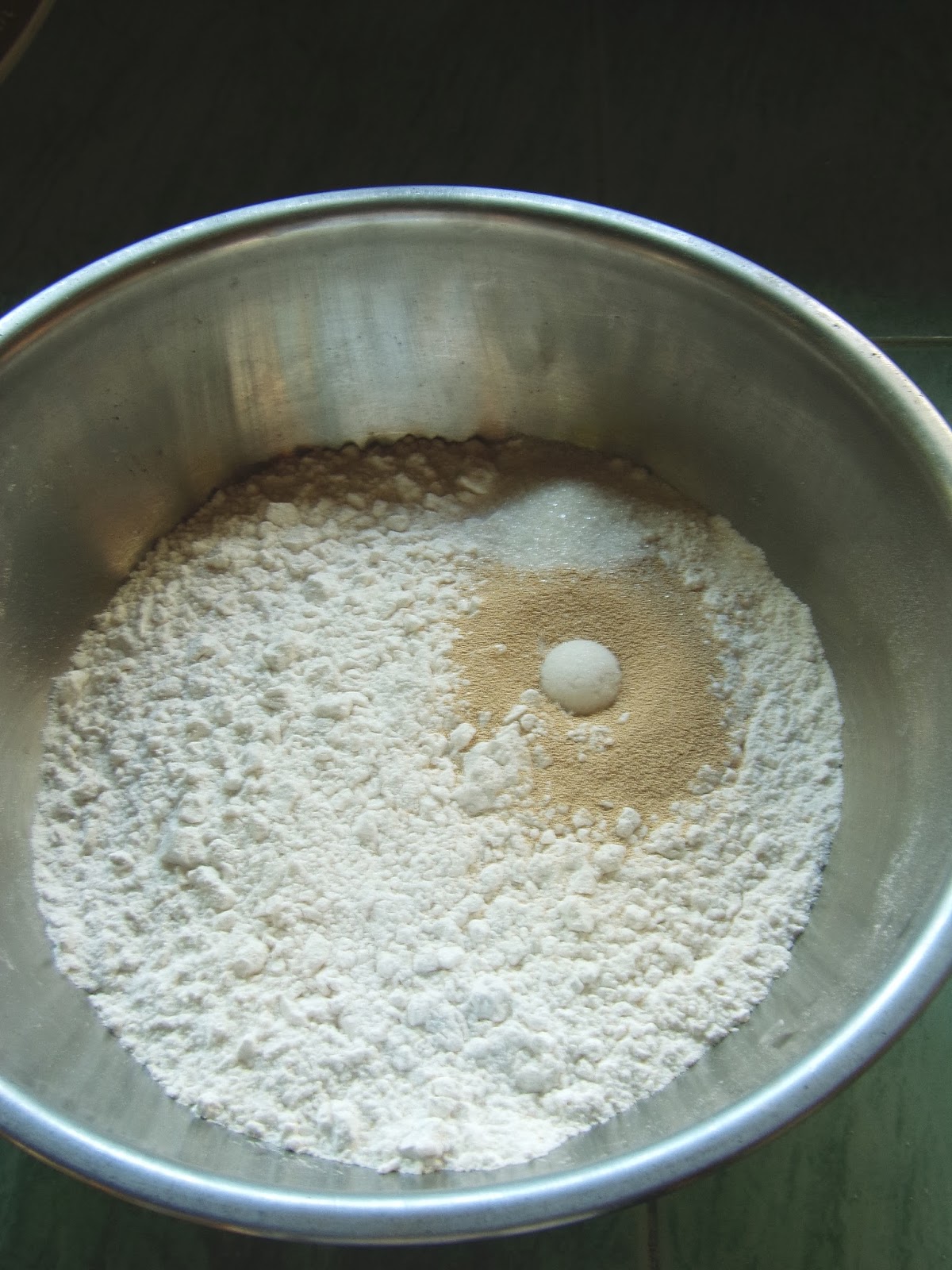For the dough, combine all dry ingredients except the quarter cup bread flour. Give it a quick whisk and set aside.