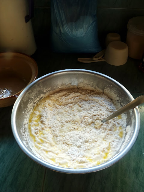 Add the olive oil mixture into the dry ingredients and mix well until every dry ingredients are incorporated. Knead for 5 to 8 minutes or until the dough is smooth and elastic and does not stick to your hands, add additional bread flour while kneading. Shape the dough in to ball and place in a well greased bowl. Cover with damped towel or with a cling wrap and leave the dough to rise for 45 minutes to an hour or until the size of the dough doubles.