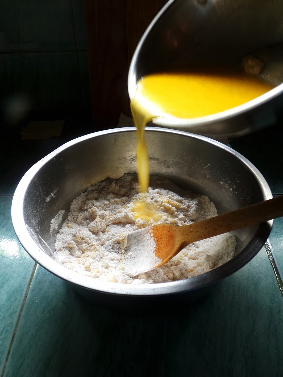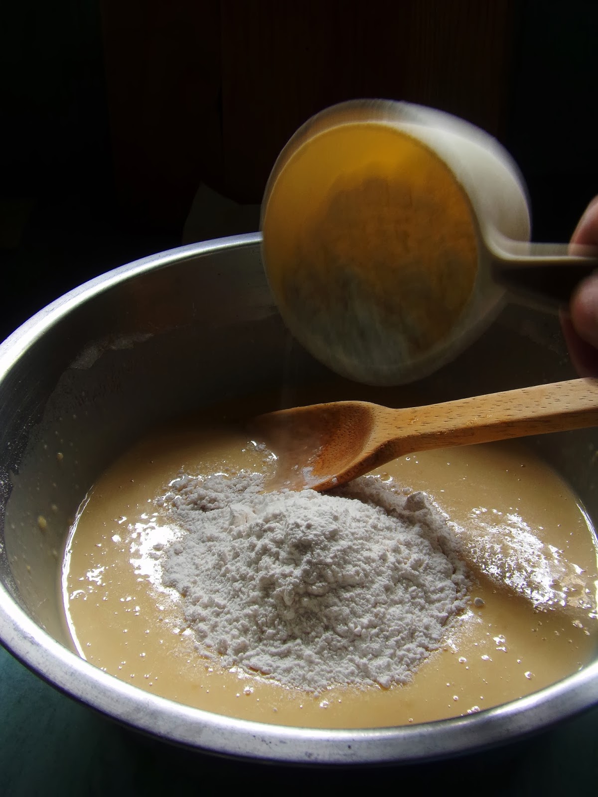 Gently pour the milk mixture into the dry flour mixture with continuous mixing using a wooden spoon.