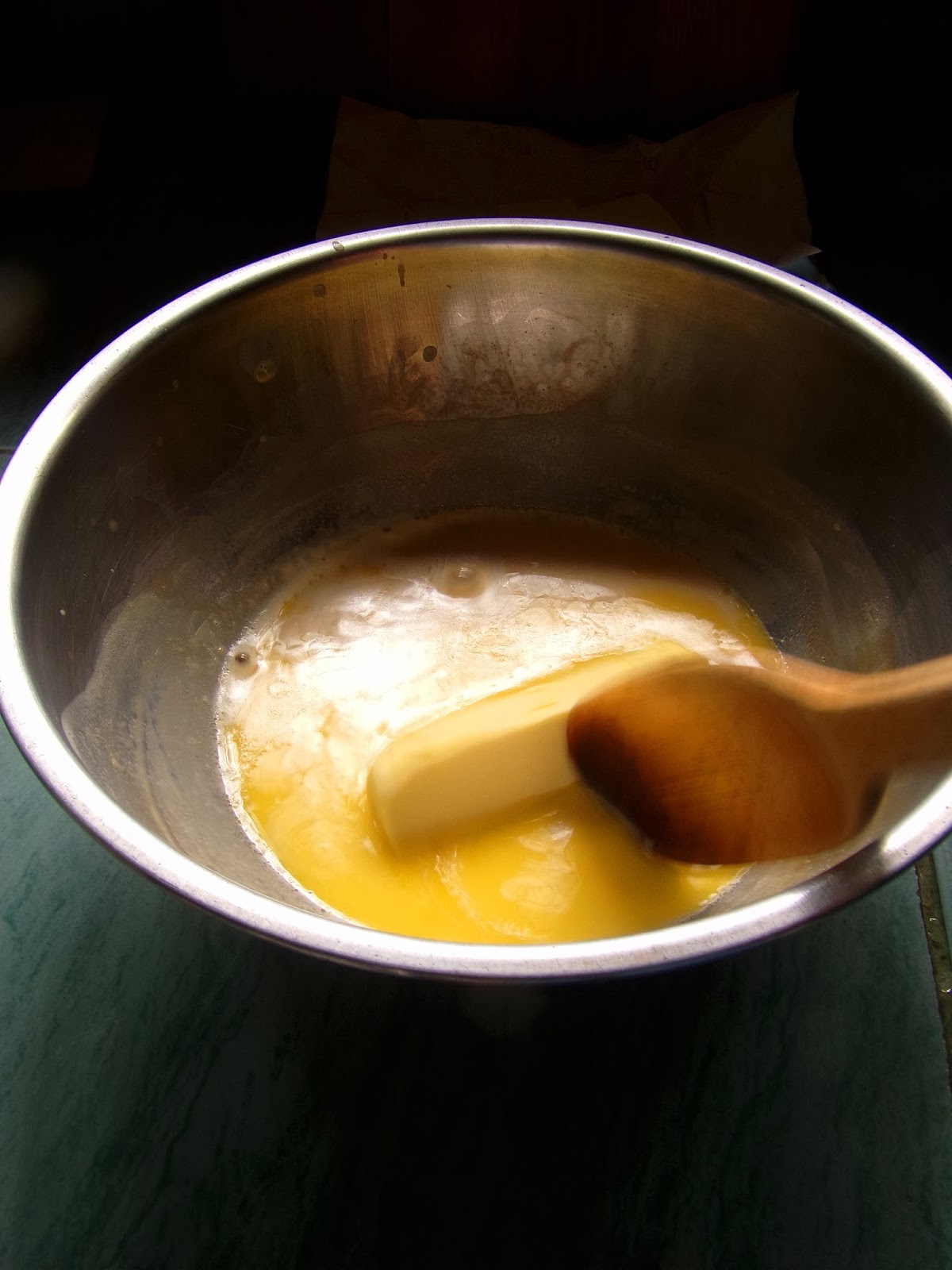 Add butter and stir until melted. Add the water and stir. The temperature must be 50 to 55 degrees Celsius. If temperature drops down, simply reheat the mixture to maintain the temperature to 50 to 55 degrees Celsius.