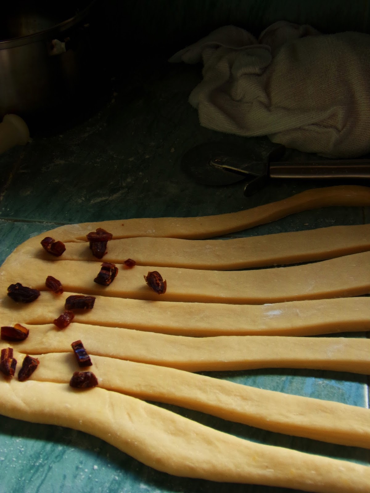Divide the dough in to two.  Flatten each dough to 9 by 12 inches sheet.  Cut the sheet in to strips leaving atleast an inch uncut to hold the strips together.  Sprinkle half of the chopped pitted dates.