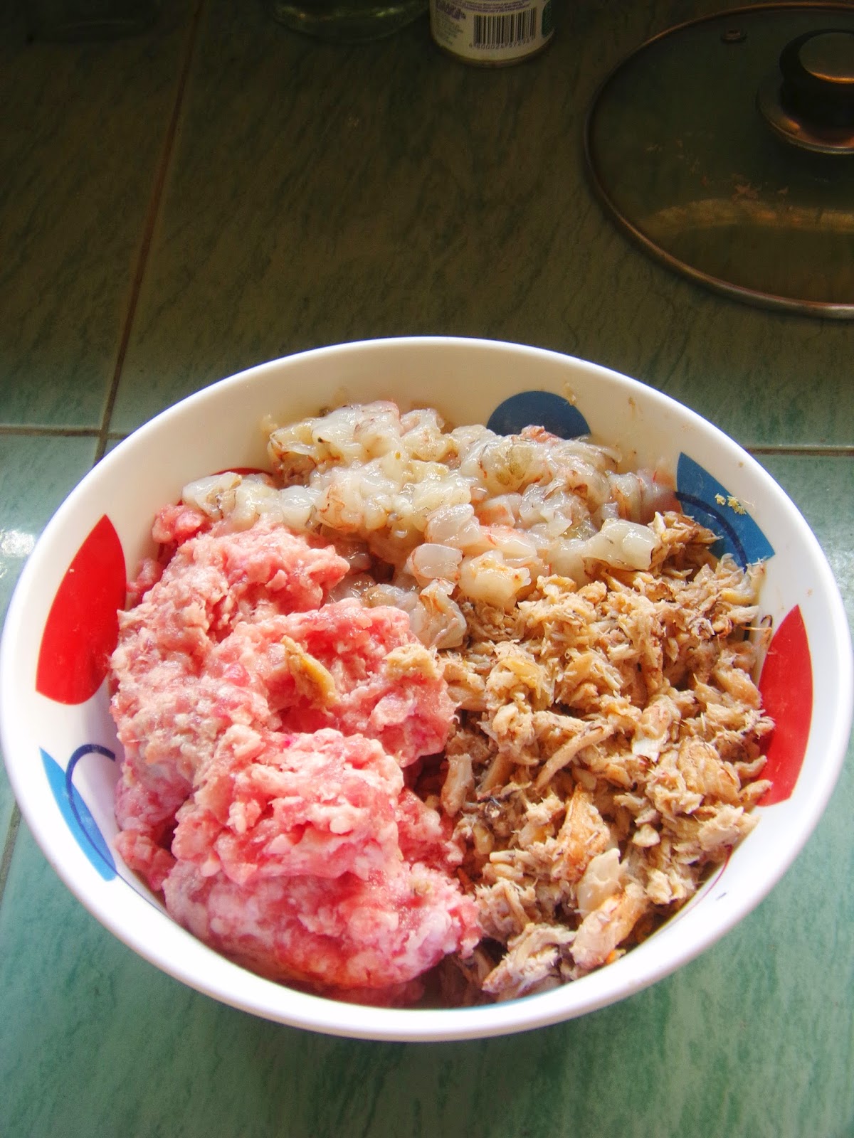 Mix the pork, shrimp and crab meat together.