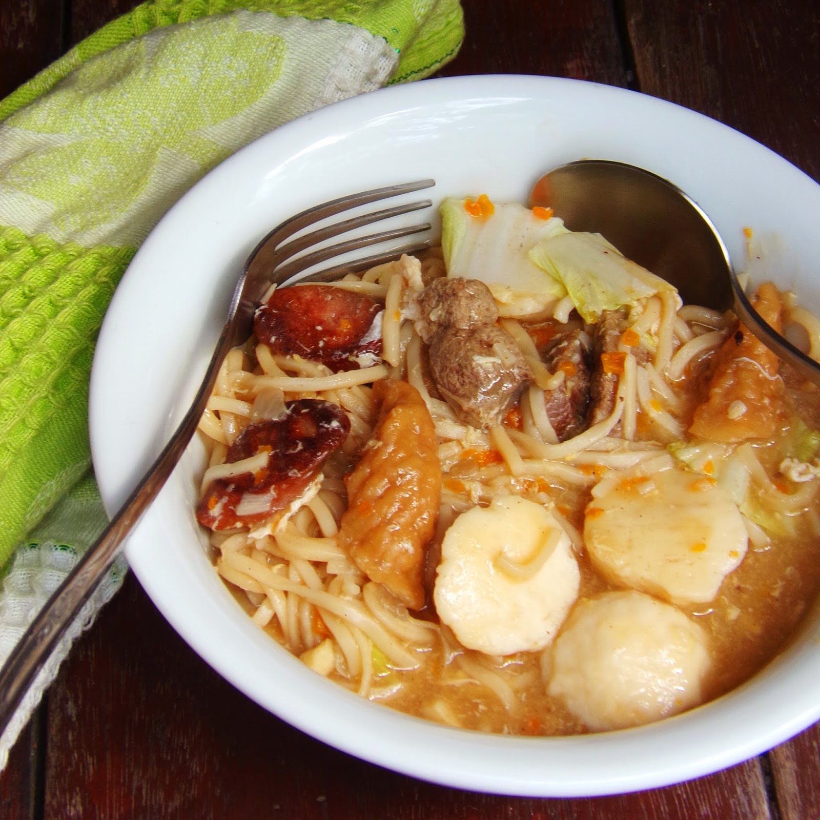 Heat wok and add oil. Saute chorizo until brown. Add garlic and onion, saute until garlic is golden brown and onion is translucent. Add pork liver and saute until brown. Add squid ball, kikiam and carrots. Add bouillon cubes and water and simmer for 15 minutes. Add beaten eggs. Dissolve cornstarch in water and add to the broth. Season with soy sauce and pepper. Add dried egg noodles and cook for another 10 minutes or until the noodles is done. The noodles should still be sightly firm with a little bite.