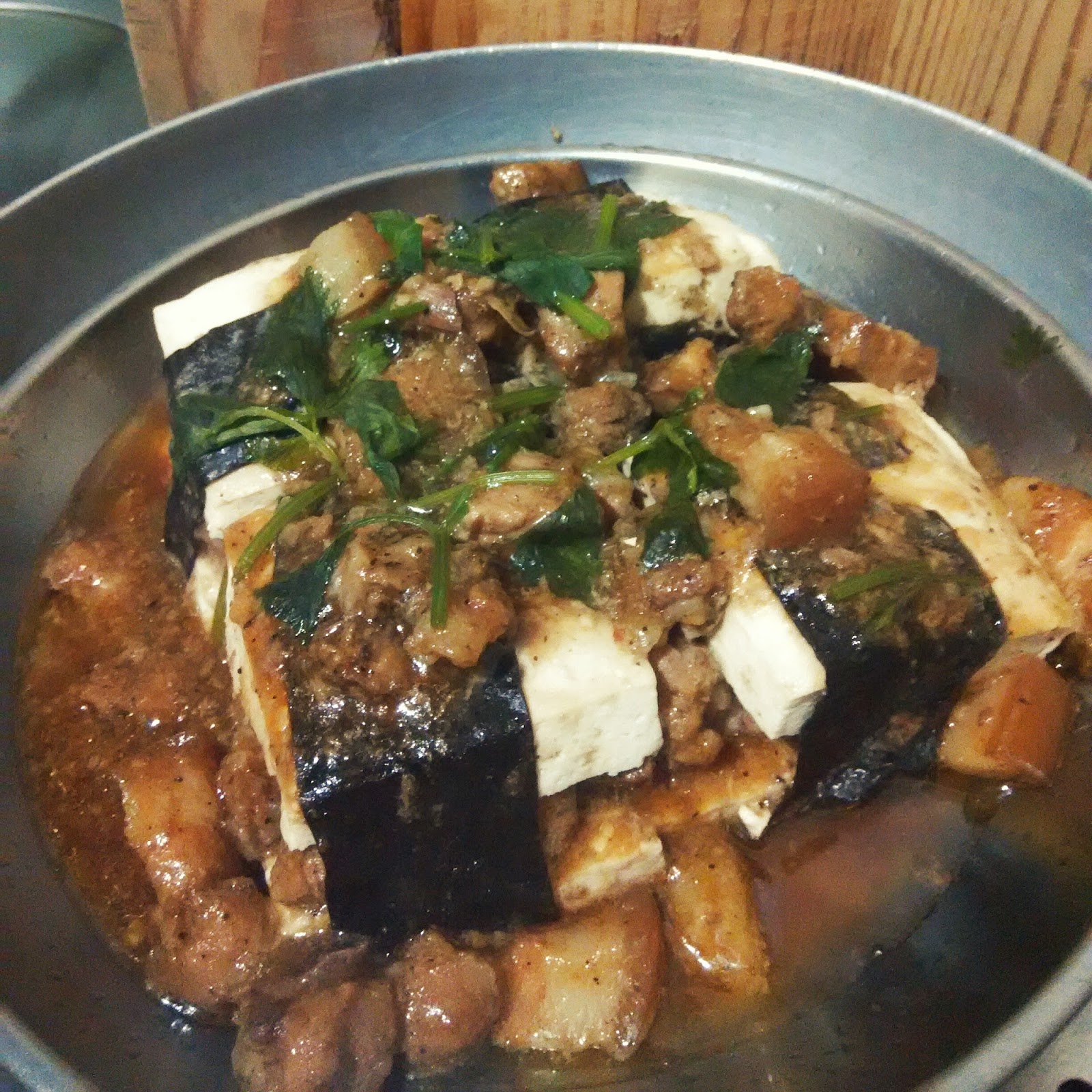 To start with the mafu tofu, I cooked the meat asado-style. I sliced the tofu into two parts cutting along the middle horizontally. I thickened the sauce of the pork asado and stuffed it in the middle of the tofu and wrap the seaweed wrapper around it. Steamed it for 20 minutes and it’s done.