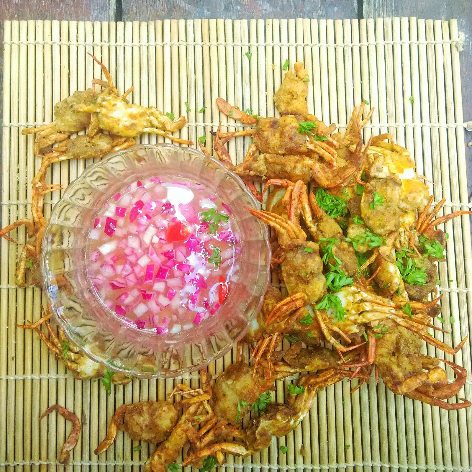 For our lunch, my mom cooked Sinigang na Isda sa Puso ng Saging. It’s a new recipe she learned from the market vendor. Then I decided to cook the crablets. Since we were only three and a quarter kilo is too much for us, I thawed half of it and marinated it in a dry rub of Spanish paprika, salt and pepper. I tossed it until the crablet are coated with the spices. Then I added 1/4 cup of flour and tossed it again until everything is covered with flour. I leave it on the counter for 30 minutes before deep frying. I prepared the vinegar dipping sauce with vinegar, onion, salt and sugar. I also added a chili to give it a few kick.