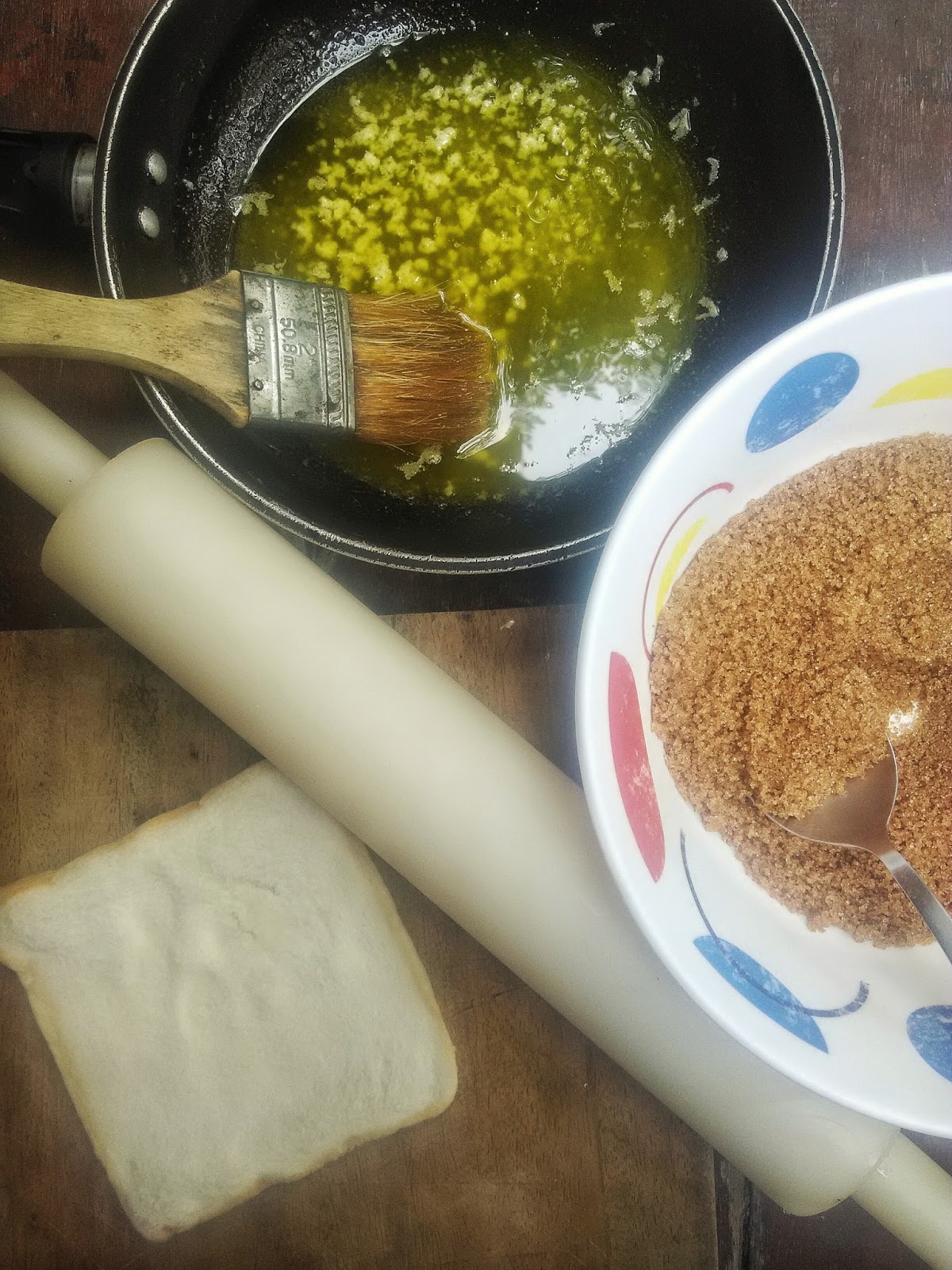 Simply flatten the sliced bread using a rolling pin. Brush it with melted butter and spread a tablespoon of cinnamon sugar. Roll it and arrange it in a baking pan and bake it in the oven. Cinnamon craving solved.