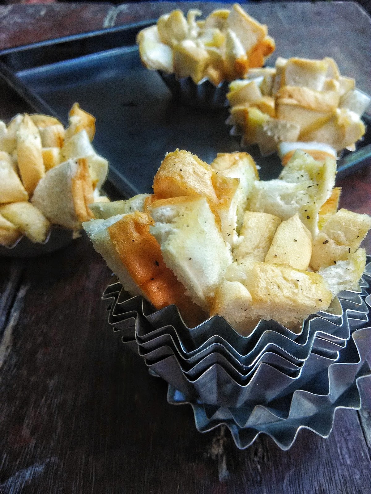 Place the sliced tasty bread in a bowl. Drizzle with olive oil and season with salt and pepper. Toss everything together and vertically arrange it in muffin cups.