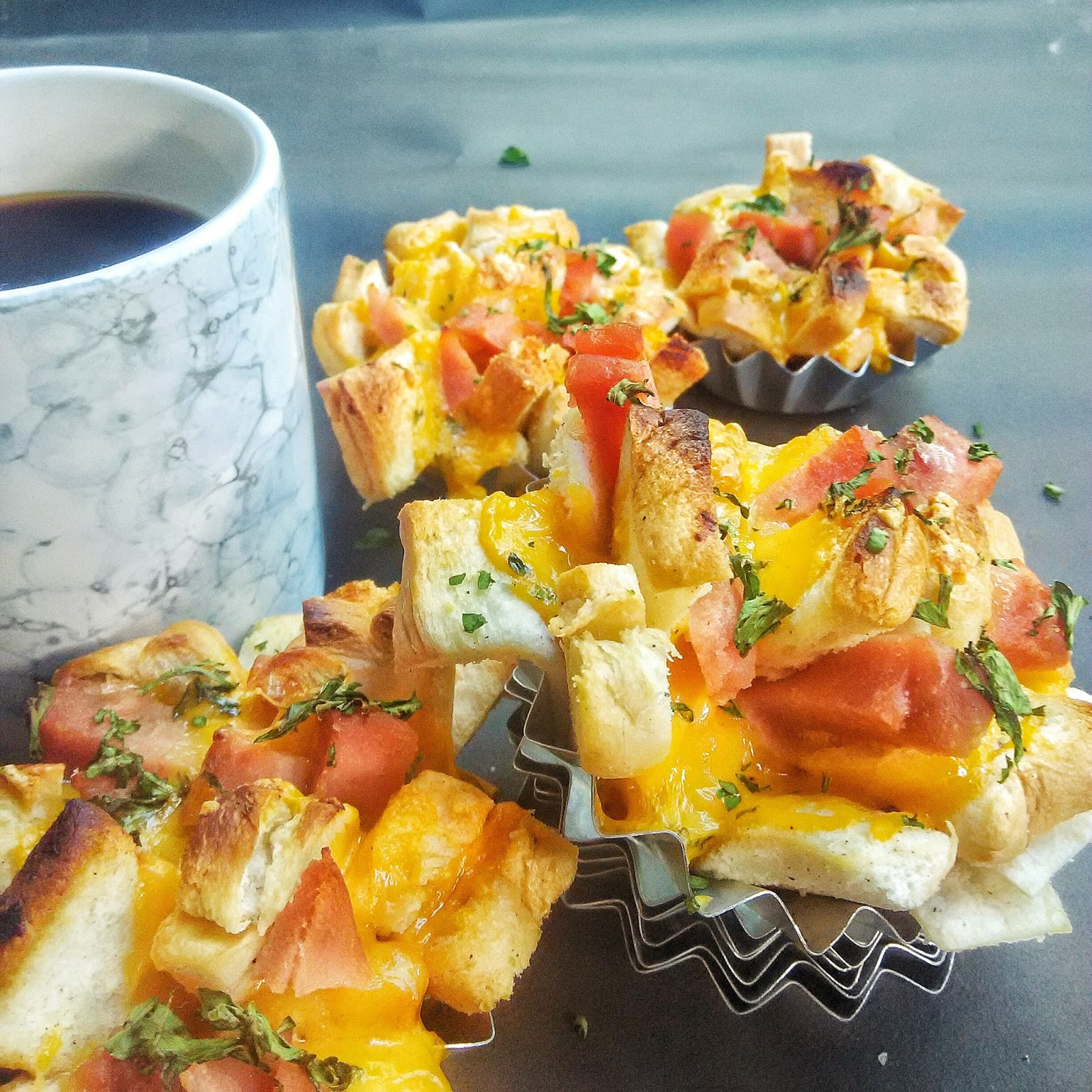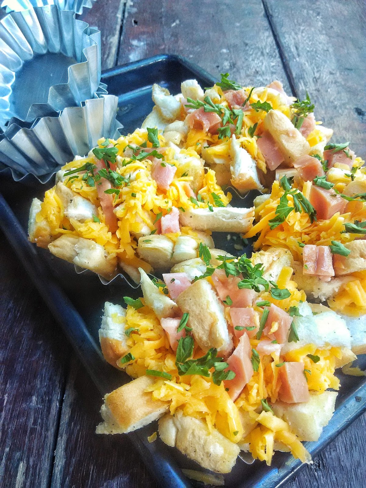 Since we are only three, I thought of dividing the tasty bread into pieces and place it in a mini muffin cups and add grated cheese and chopped sweet ham. The good thing about this is, you can serve it to individual person and you don’t have to use whole fancy bread or whatsoever.