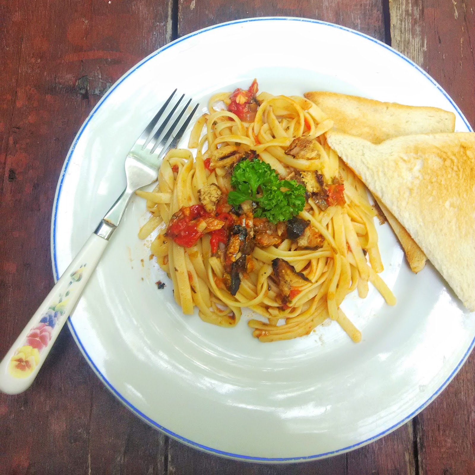 Add the chopped baked sardines and chopped parsley and simmer for another 10 minutes. Mixed with the fettuccine pasta and serve.