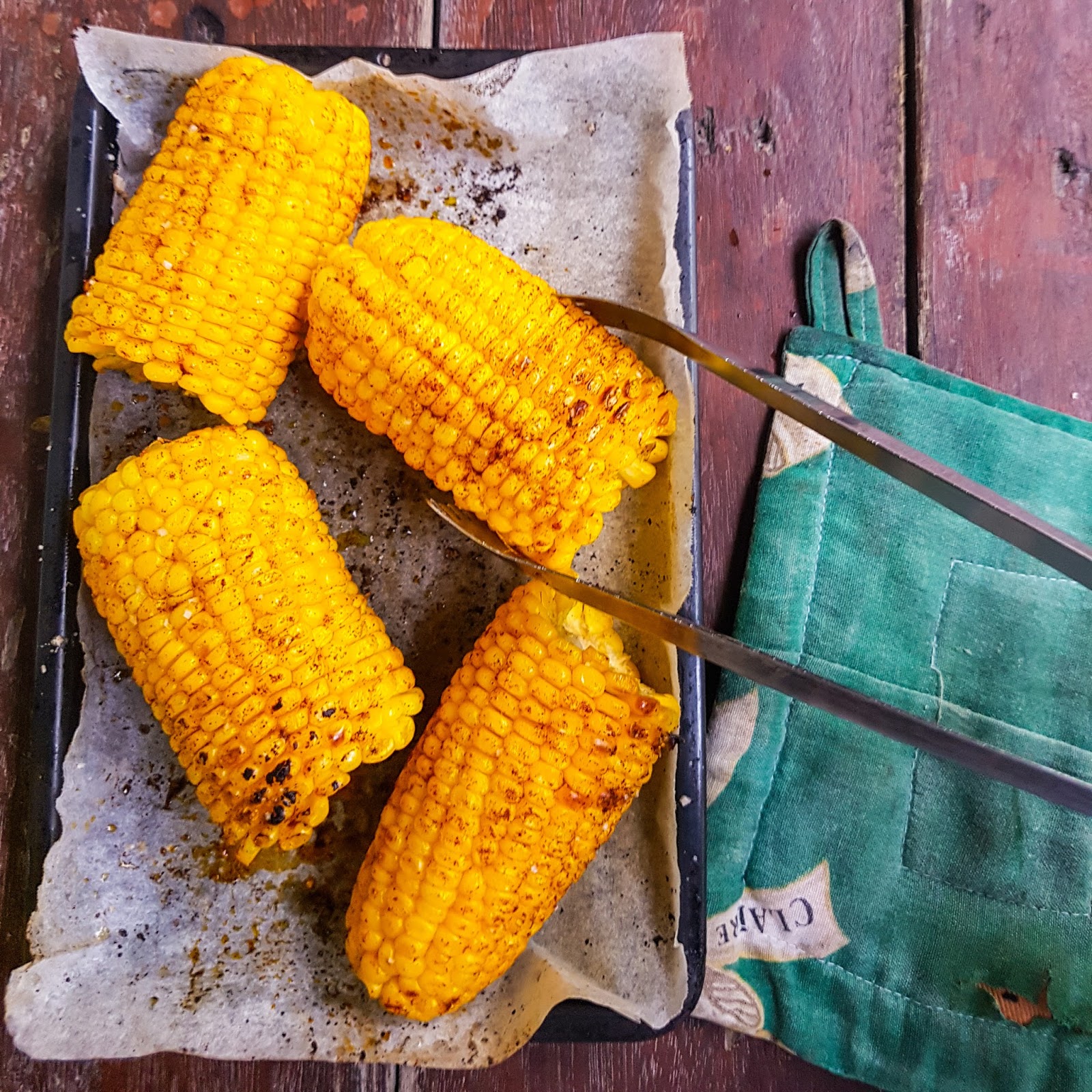 Pat dry the corn and brush with melted butter. Season with Spanish Paprika and salt. Bake for 10 to 15 minutes.