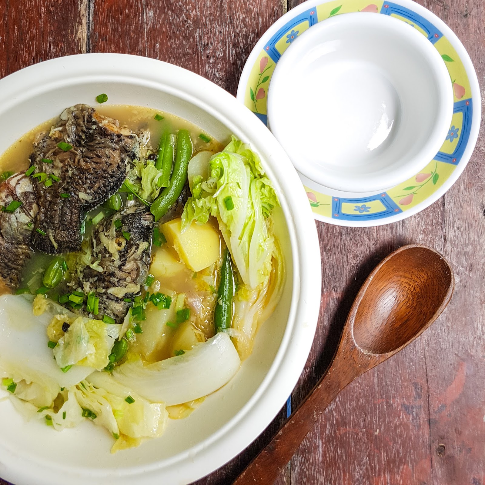Saute ginger, garlic and onion into the vegetable oil. Add two cups of the rice wash and simmer for 5 minutes. Add the fried tilapia, potatoes and the rest of the rice wash. Simmer for 10 minutes or until the potatoes are done. Add the Baguio beans and simmer for five minutes. Add the cabbage, Petchay Baguio and whole black pepper. Simmer for 3 minutes. Season with fish sauce and black pepper. Garnish with onion chives.